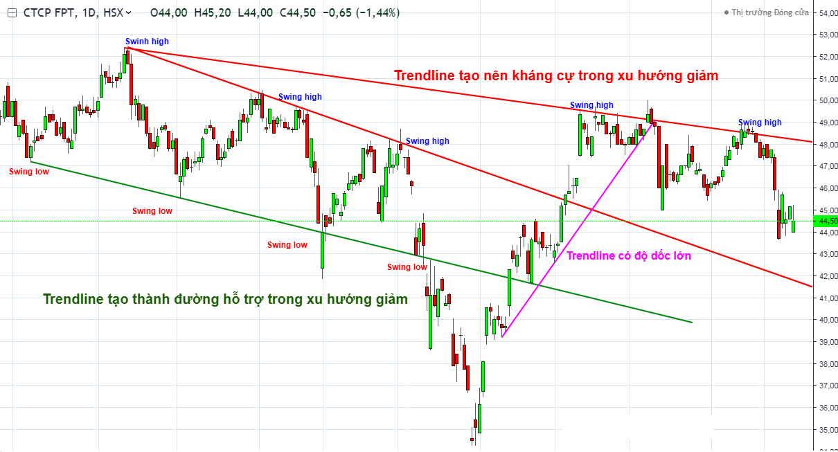 Định nghĩa: đường xu hướng cho biết xu hướng trong tương lai của giá, đồng thời cho biết các điểm kháng cự và hỗ trợ trong tương lai.