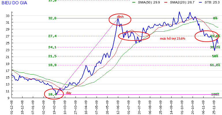 Thông thường 1 cổ phiếu lên hoặc xuống sẽ dừng lại tại những mức hỗ trợ hoặc kháng cự 0%, 23.6%, 38.2, 50%, 61.8%, 100%...