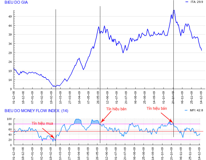Cũng như RSI, MFI có 2 ngưỡng quan trọng là 20-80. Dưới 20 là ngưỡng quá bán, và trên 80 là ngưỡng quá mua.
