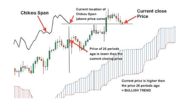 Sở dĩ có tên gọi là đường trễ vì Chikou Span được vẽ lùi về sau 26 phiên giao dịch. Đường này cho chúng ta nhìn thấy và so sánh được giá ở thời điểm hiện tại và giá ở thời điểm cách 26 phiên trước đó.