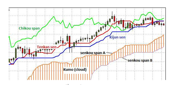 Như đã nhắc đến ở trên, Ichimoku bao gồm 5 thành phần, cụ thể là 5 đường, trong đó có 2 đường tạo thành với nhau tựa như hình dạng của đám mây, đám mây này được gọi là Ichimoku (tên gọi khác là Kumo).