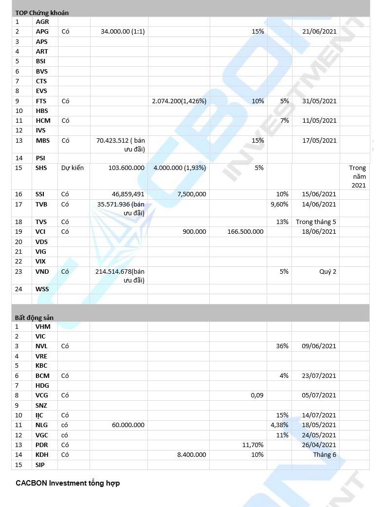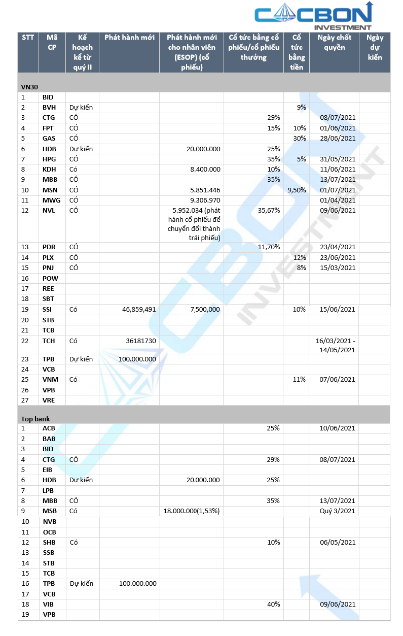 Ngày 01/07/2021, đội ngũ CACBON Investment đã thống kê về kế hoạch tăng vốn và chia cổ tức của các doanh nghiệp niêm yết trên thị trường của các nhóm VN30, nhóm các cổ phiếu dẫn đầu dòng Ngân hàng, Chứng khoán, Bất động sản. Cho thấy, chiếm đa số các doanh nghiệp đã tận dụng thị trường đang nằm ở vùng giá cao để chạy đua tăng vốn trong quý II và quý III/2021. Đặc biệt, 2 khối tăng vốn mạnh nhất là khối ngân hàng với việc tăng tốc để đạt chuẩn Basel II và sắp tới là Basel III, cùng với đó là khối chứng khoán tăng vốn để nới rộng không gian cho vay margin trong bối cảnh thị trường rất tích cực, thanh khoản thị trường dồi dào.