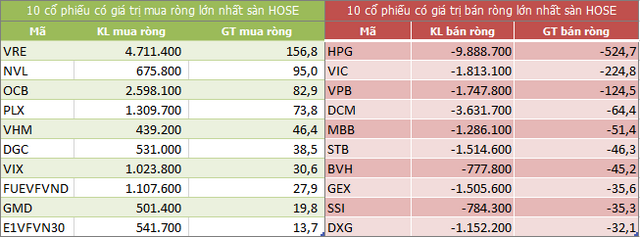 HPG vẫn bị khối ngoại bán ròng mạnh với giá trị lên đến 525 tỷ đồng. VIC và VPB bị bán ròng lần lượt 225 tỷ đồng và 124 tỷ đồng. Chiều ngược lại, VRE đứng đầu danh sách mua ròng của khối ngoại với 157 tỷ đồng. NVL và OCB được mua ròng lần lượt 95 tỷ đồng và 83 tỷ đồng.