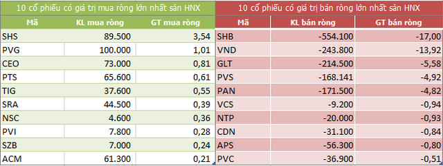 SHB bị khối ngoại sàn HNX bán ròng mạnh nhất với 17 tỷ đồng. VND và GLT bị bán ròng lần lượt 14 tỷ đồng và 5,6 tỷ đồng. Chiều ngược lại, SHS và PVG là 2 cổ phiếu hiếm hoi sàn này được khối ngoại mua ròng trên 1 tỷ đồng. Trong đó, SHS được mua ròng mạnh nhất với 3,5 tỷ đồng. PVG cũng được mua ròng 1 tỷ đồng.