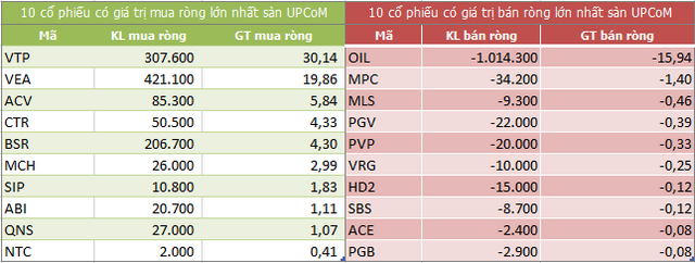 Khối ngoại sàn UPCoM mua ròng mạnh nhất mã VTP với 30 tỷ đồng. VEA đứng sau và được mua ròng gần 20 tỷ đồng. Trong khi đó, OIL bị bán ròng mạnh nhất với 16 tỷ đồng, bỏ xa mã đứng sau là MPC với 1,4 tỷ đồng.