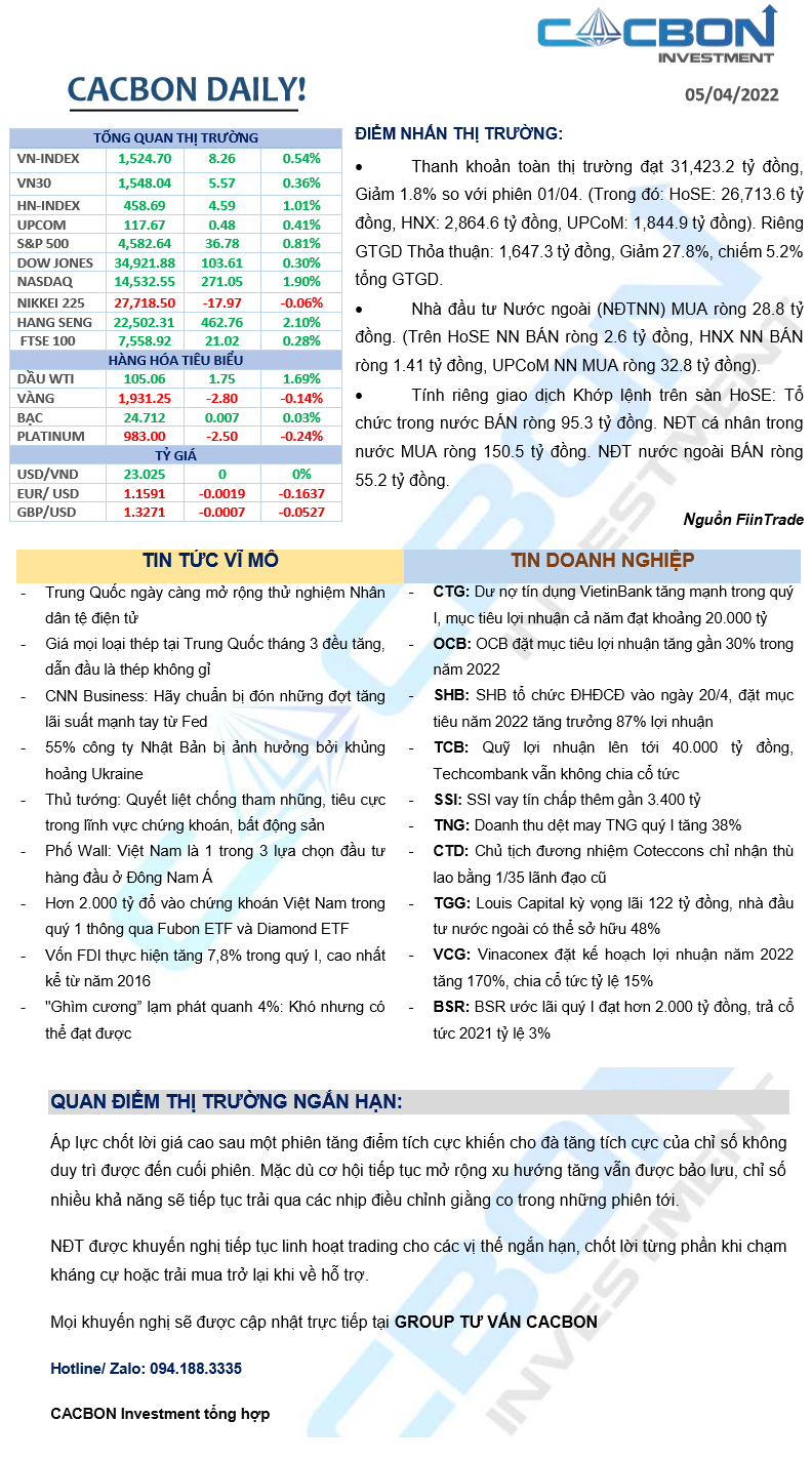 Nhật ký thị trường 05/04/2022 - VN-Index có thể sẽ kiểm định lại vùng 1,517-1,523 điểm
