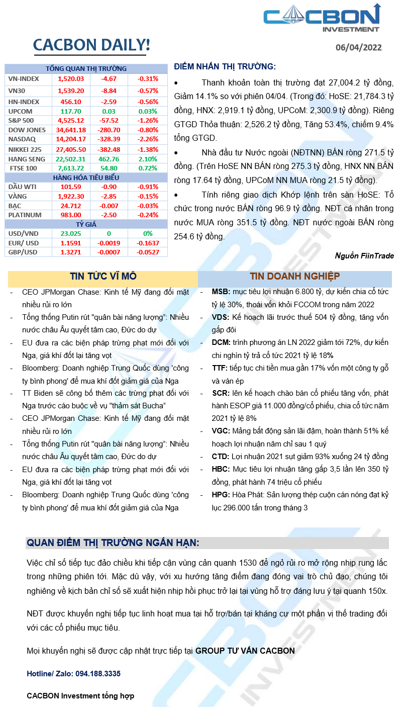 Nhật ký thị trường 06/04/2022 - Tạm dừng tại ngưỡng 1.520 điểm