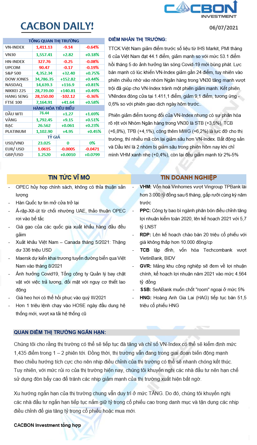 Nhật ký thị trường 06/07/2021 - Ngân hàng nâng đỡ VN-Index khỏi phiên giảm sâu