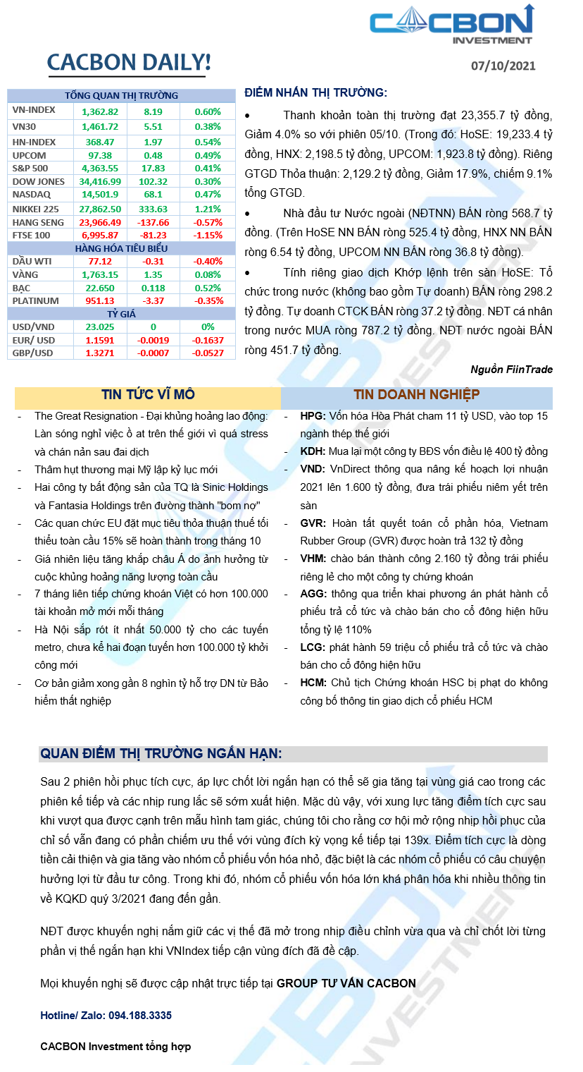 Nhật ký thị trường 07/10/2021 - Nhóm cổ phiếu vốn hoá vừa và nhỏ giao dịch sôi động