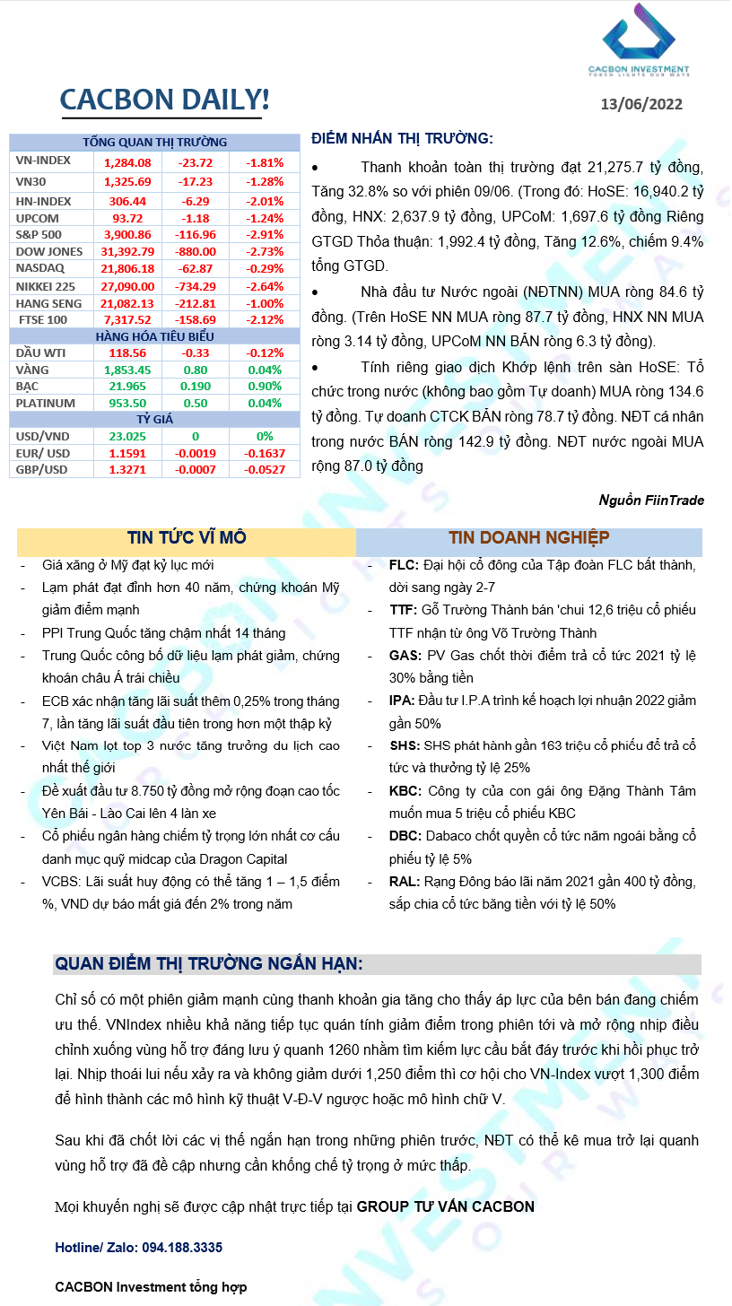 Nhật ký thị trường 13/06/2022 - Lực cầu suy yếu VN-Index rơi trở lại vùng tích dưới 1,300 điểm