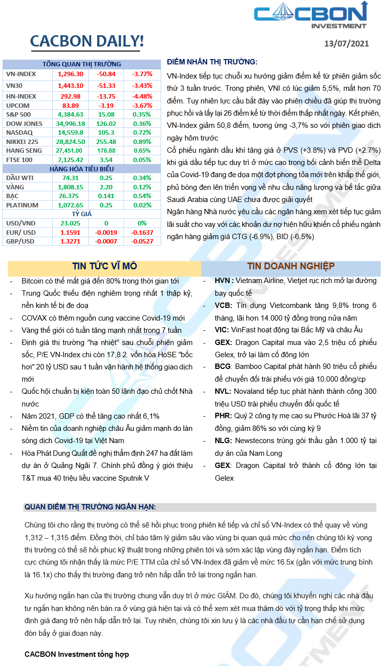 Nhật ký thị trường 13/07/2021 - Lực cầu bắt đáy giúp giảm đà bán tháo