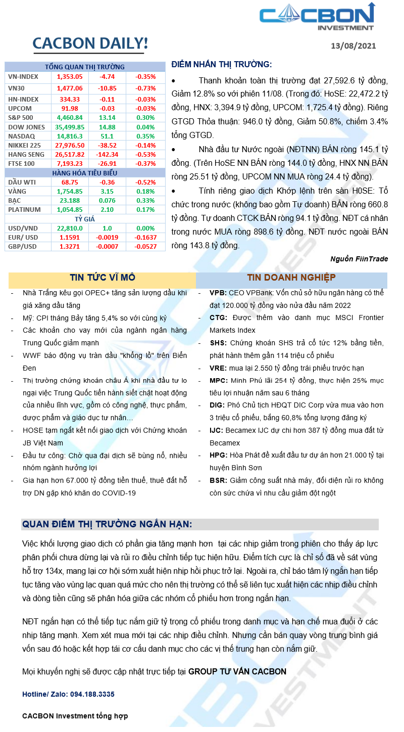 Nhật ký thị trường 13/08/2021 - Áp lực chốt lời tiếp tục đeo bám