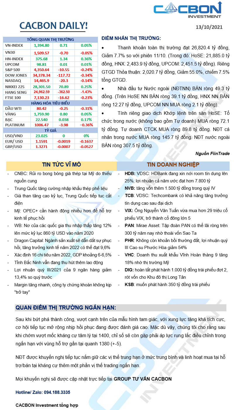 Nhật ký thị trường 13/10/2021 - Chỉ số VN-Index giằng co dưới mức 1,400 điểm