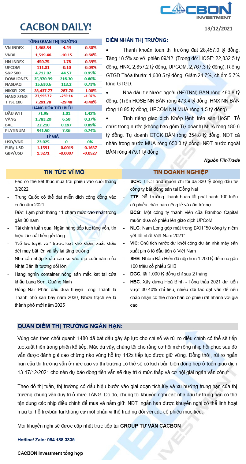 Nhật ký thị trường 13/12/2021 - Hồi phục sau hoảng loạn, VN-Index vượt mốc 1.460