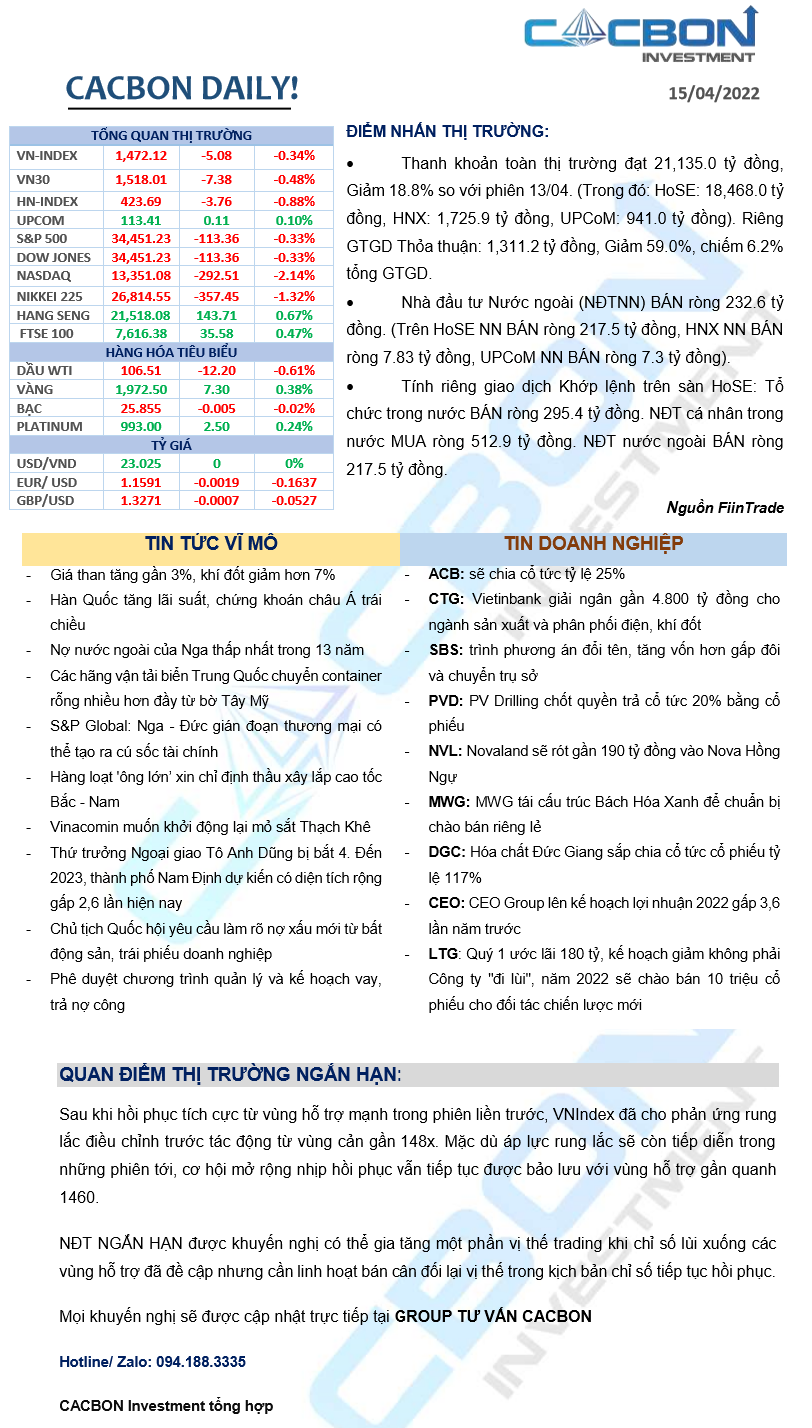 Nhật ký thị trường 15/04/2022 - VNIndex sẽ đối mặt tác động từ vùng cản gần 148x
