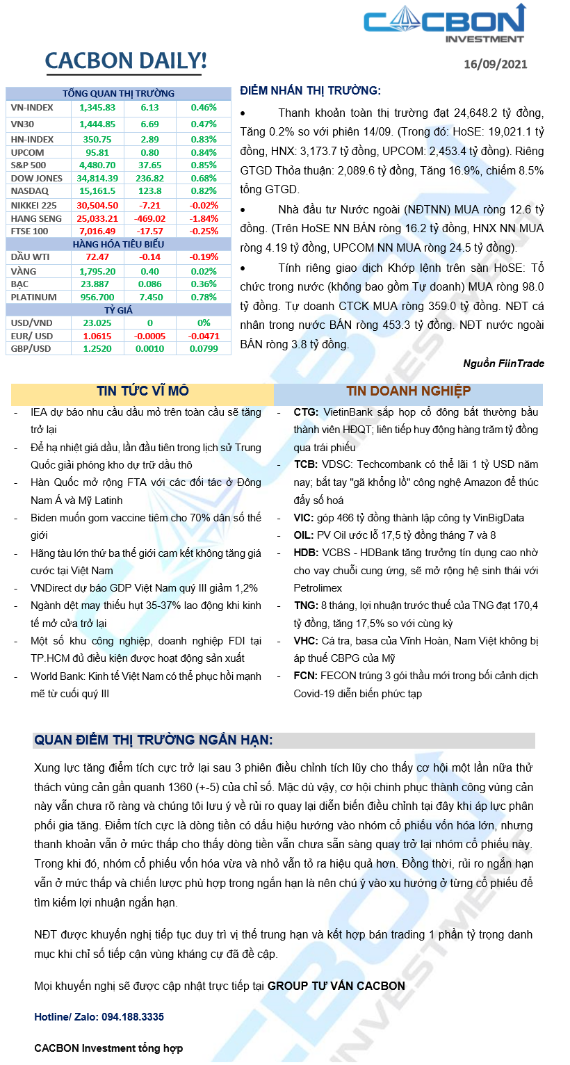 Nhật ký thị trường 16/09/2021 - Khối ngoại mua ròng trở lại