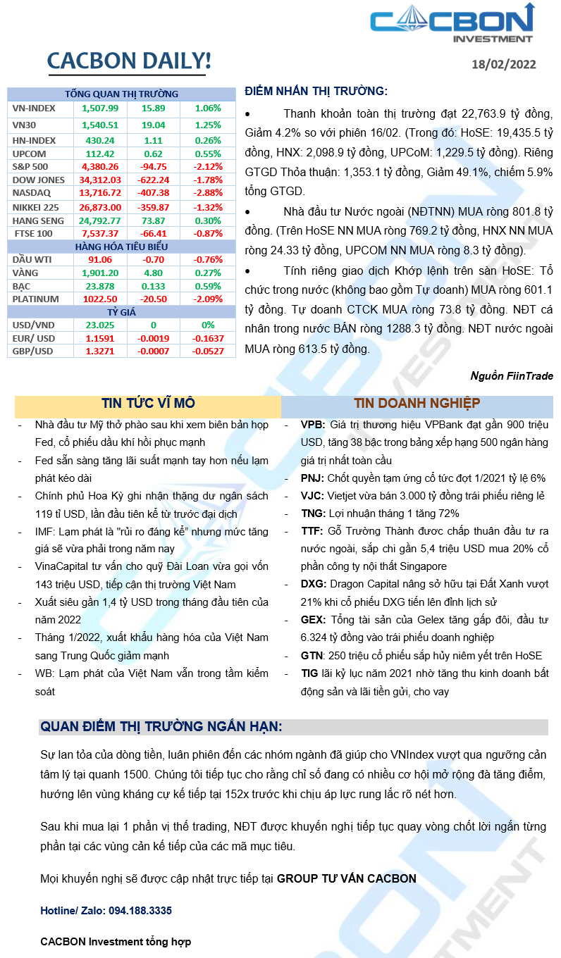 Nhật ký thị trường 18/02/2022 - Ngưỡng cản tâm lý quanh vùng 1500