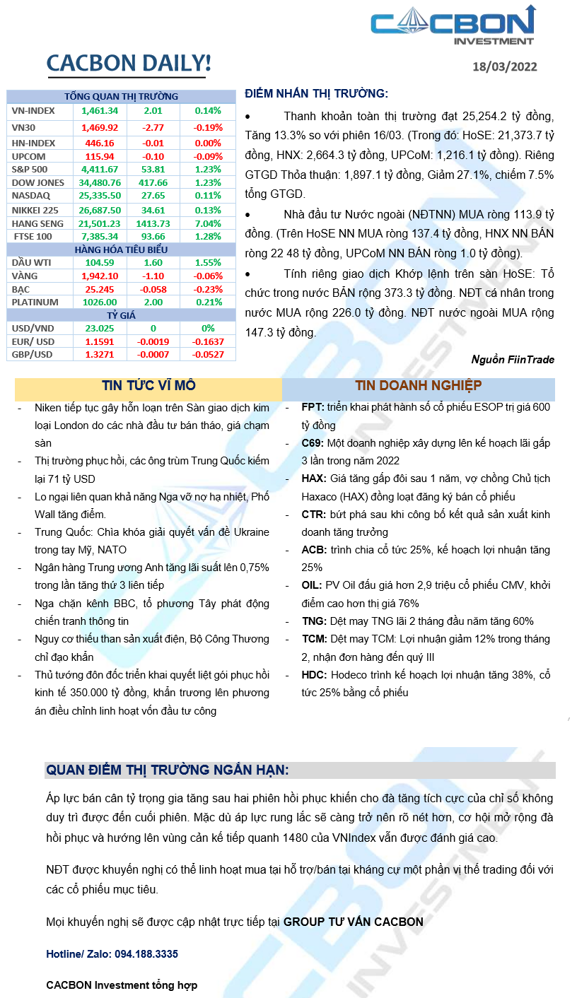 Nhật ký thị trường 18/03/2022 - Thanh khoản cải thiện