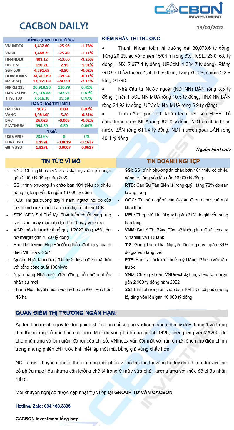 Nhật ký thị trường 19/04/2022 - Áp lực bán lấn áp, các chỉ số giảm sâu