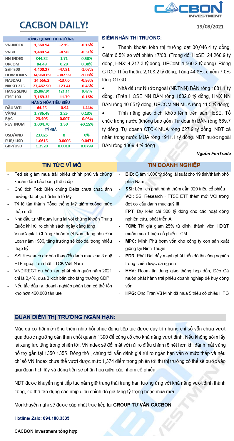 Nhật ký thị trường 19/08/2021 - VNI kiểm định lại đỉnh 1,374 điểm