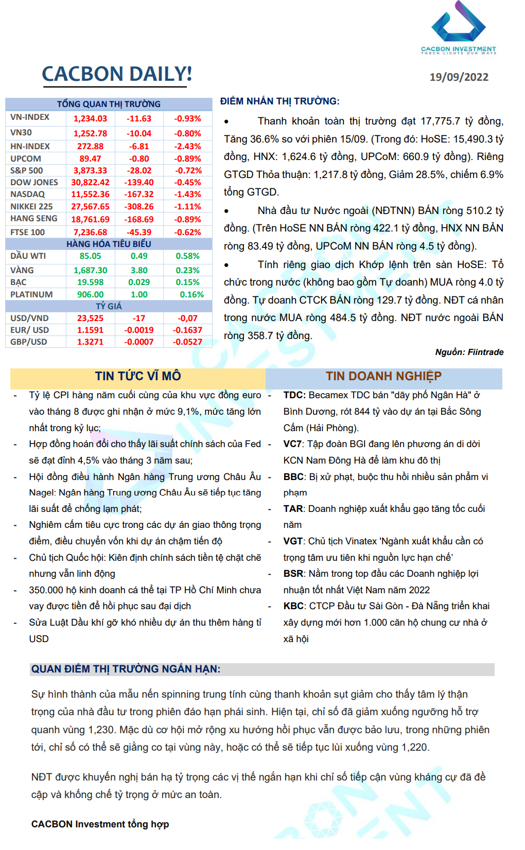 Nhật ký thị trường 19/09/2022 - VN Index sẽ kiểm lại vùng hỗ trợ gần 1.230 điểm