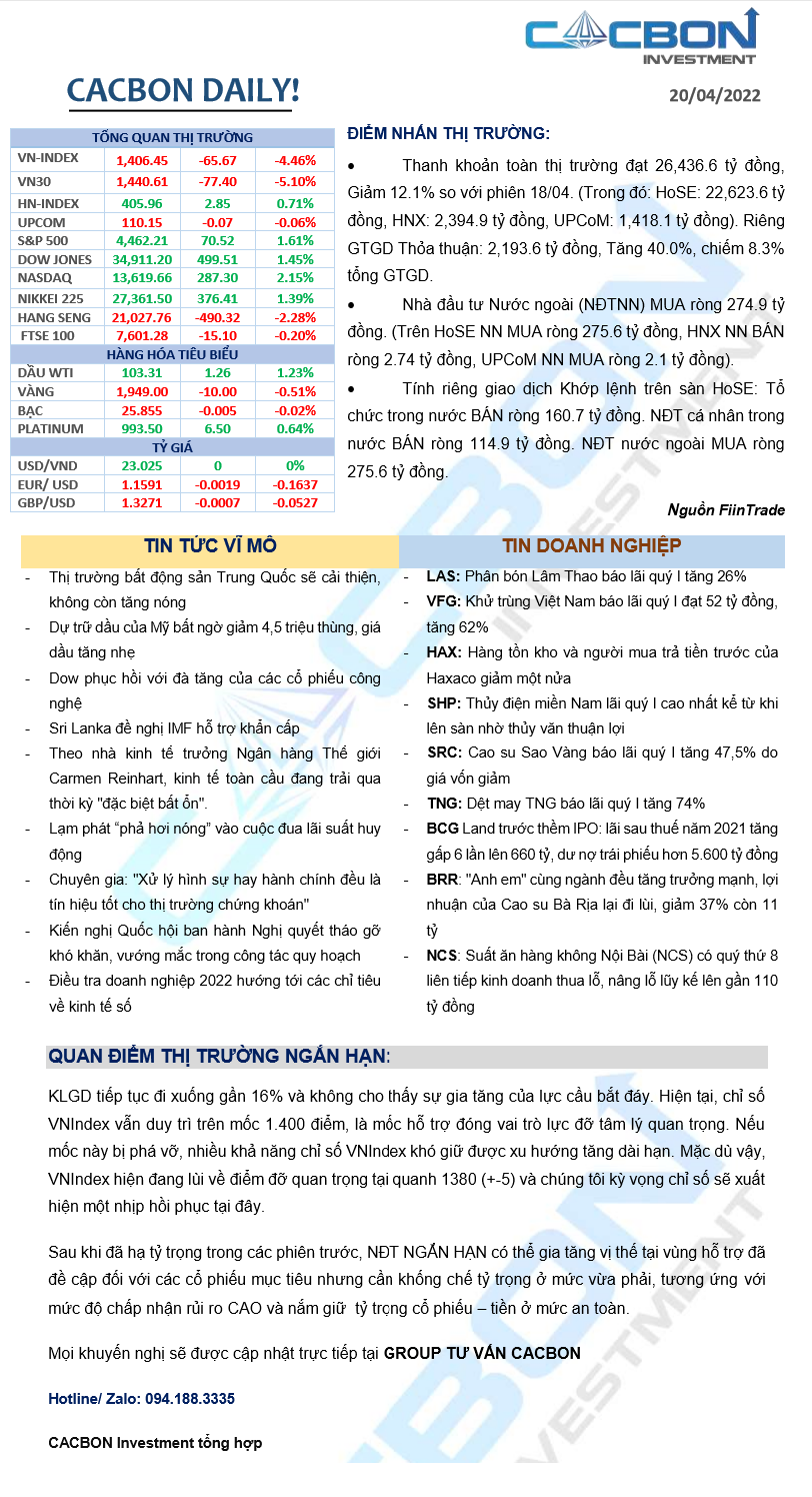 Nhật ký thị trường 20/04/2022 - Nhóm vốn hóa lớn Không thể giữ nhịp tăng cho VN-Index