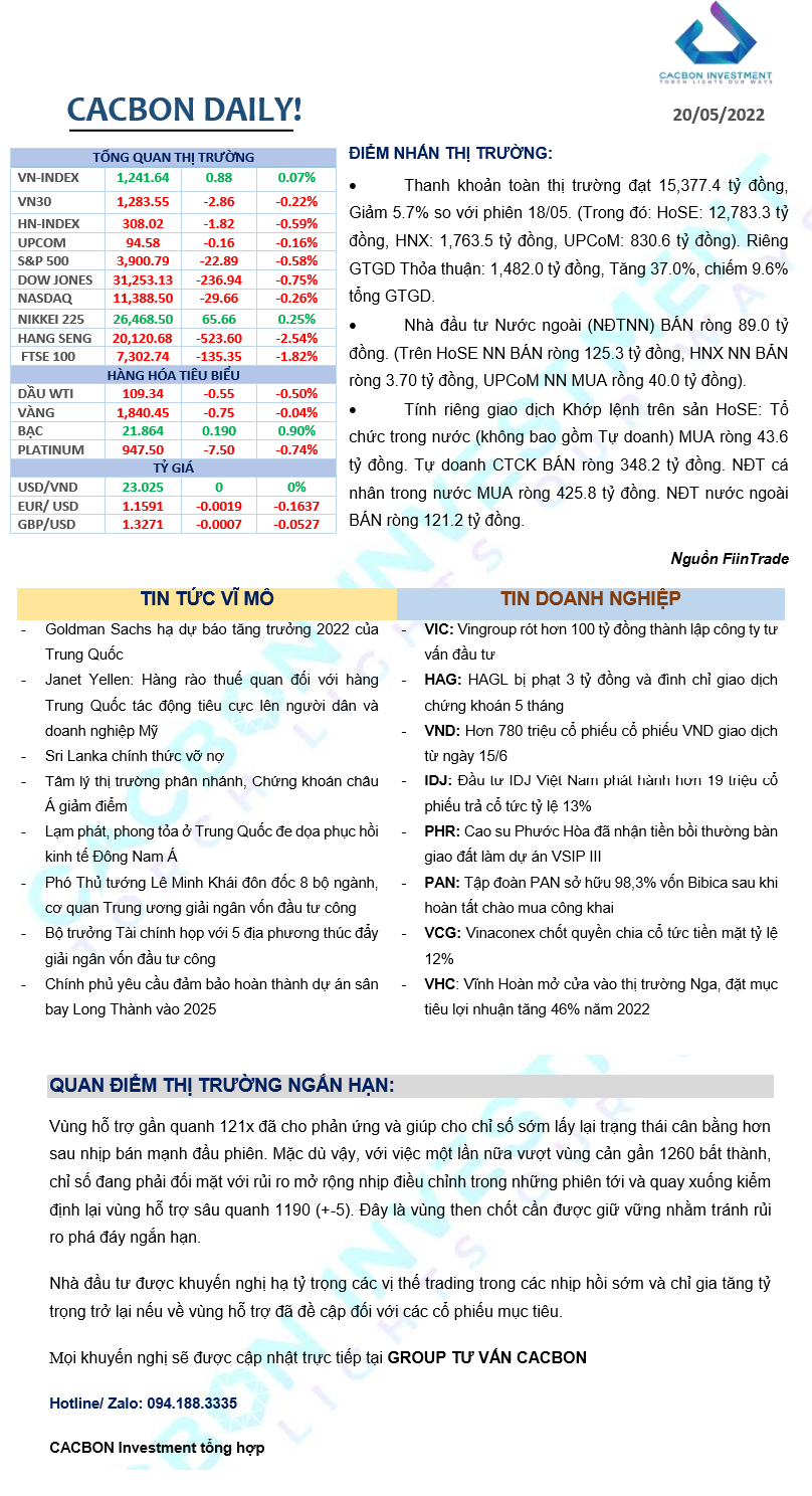 Nhật ký thị trường 20/05/2022 - Vùng hỗ trợ gần quanh 121x đã cho phản ứng