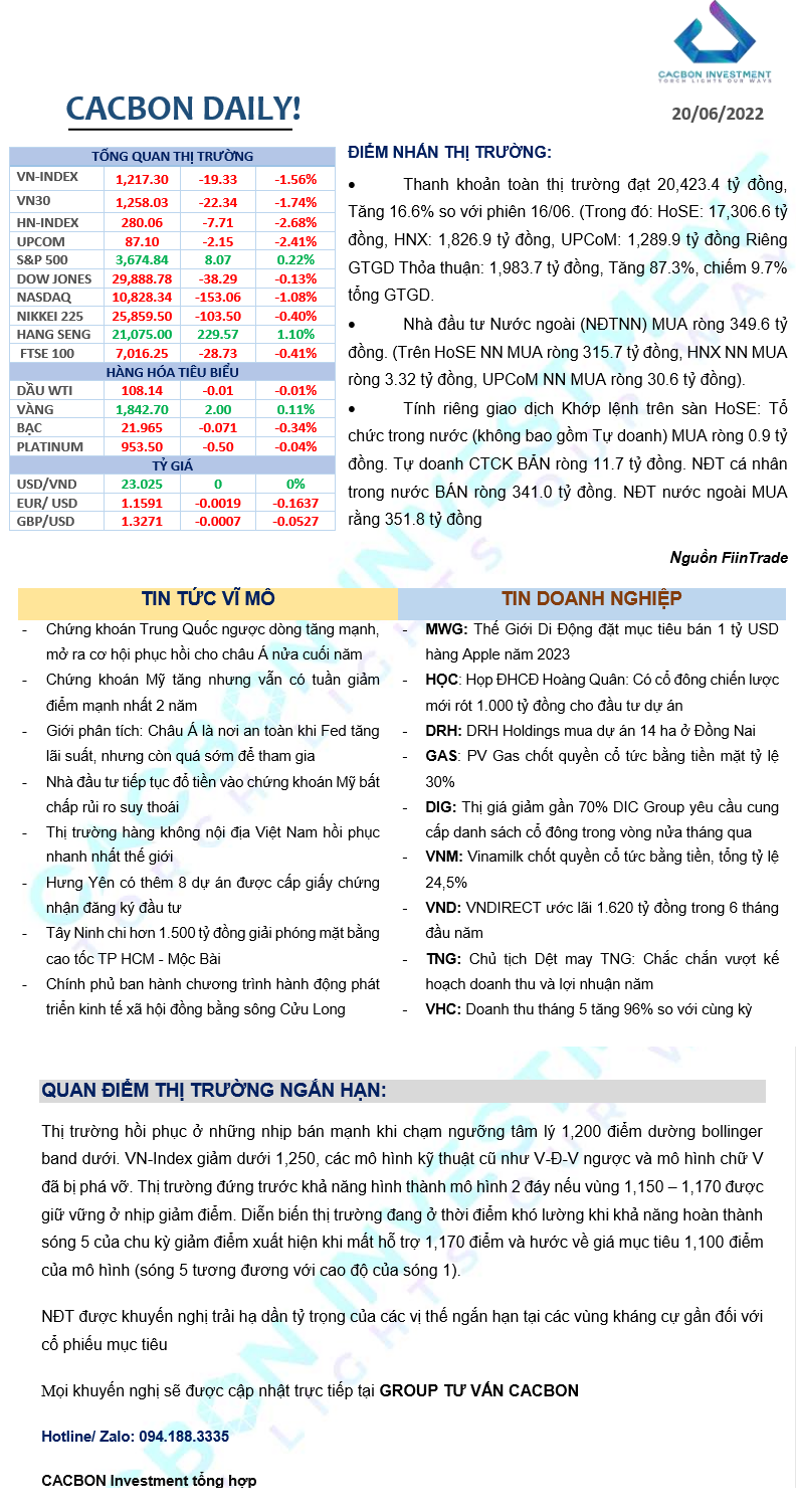 Nhật ký thị trường 20/06/2022 - Áp lực bán từ thông tin tăng lãi suất