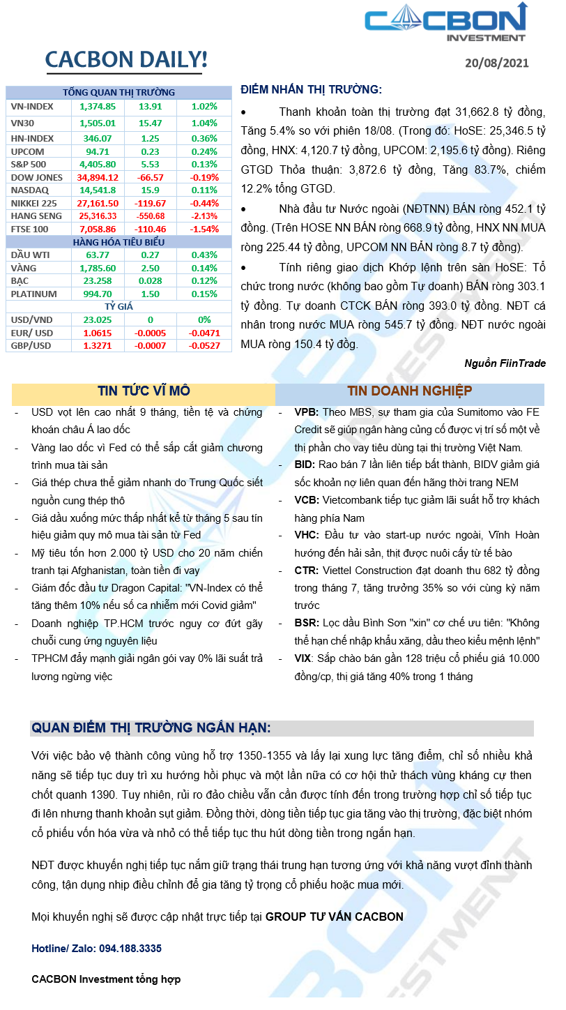 Nhật ký thị trường 20/08/2021 - VNI tiếp tục kiểm định lại 1,374 điểm