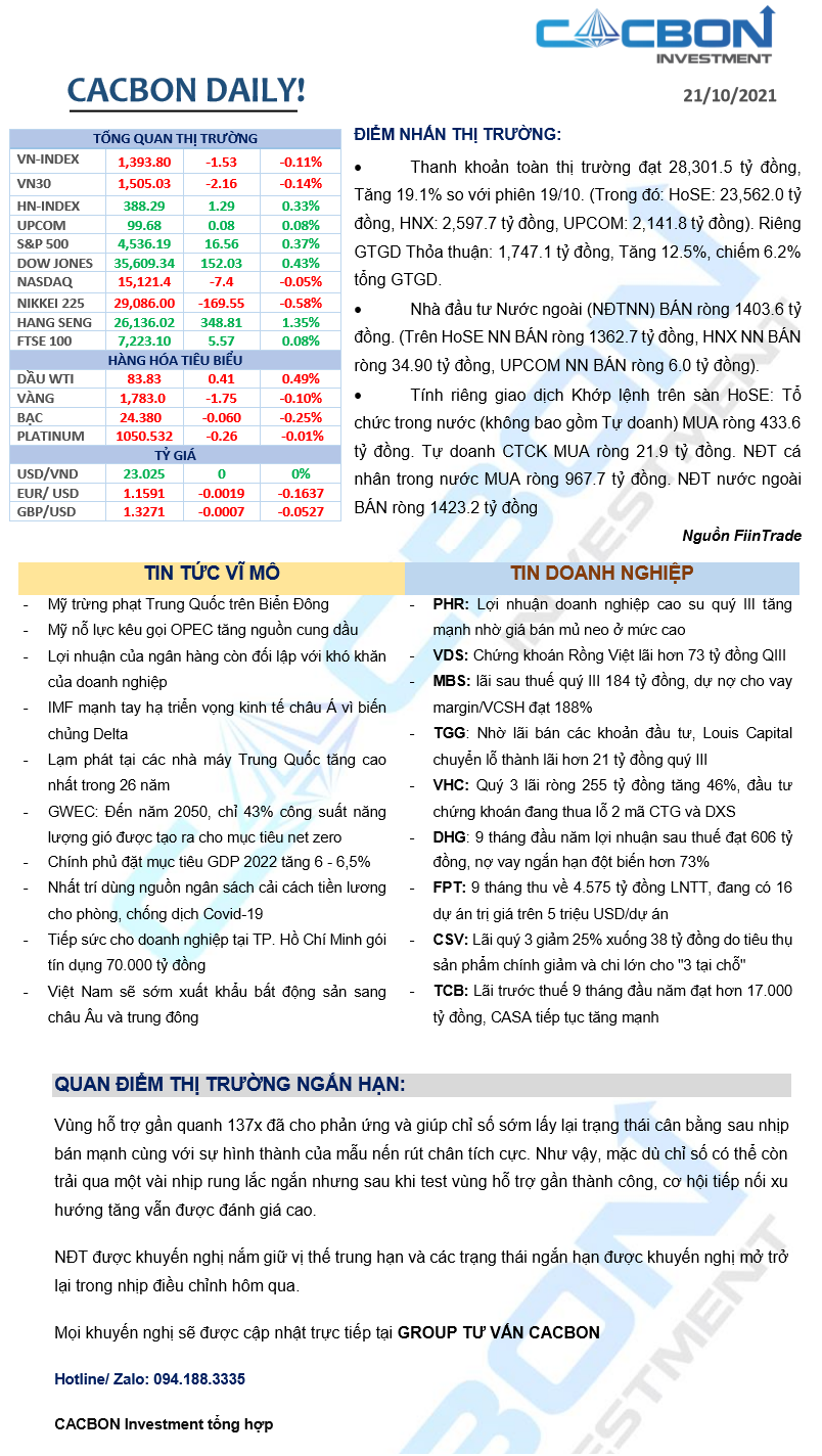 Nhật ký thị trường 21/10/2021 - Khối ngoại tiếp tục bán ròng