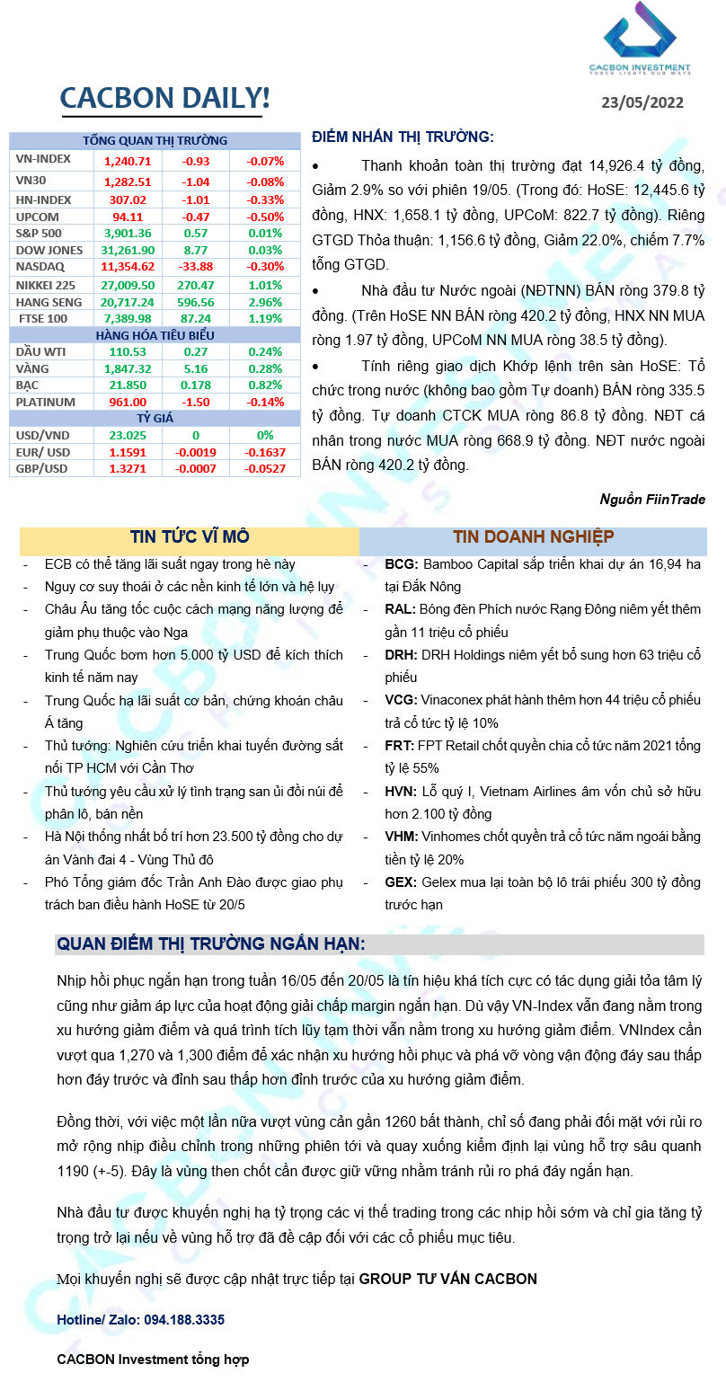 Nhật ký thị trường 23/05/2022 -Tâm lý thị trường tích cực, chờ các tín hiệu xác nhận đáy?