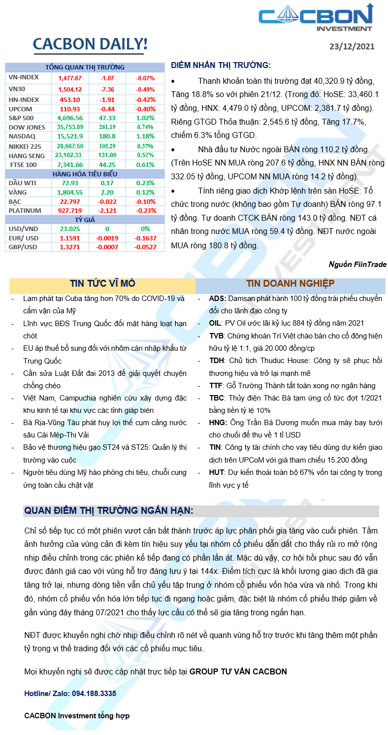 Nhật ký thị trường 23/12/2021 - Áp lực bán mạnh tại nhóm Ngân hàng