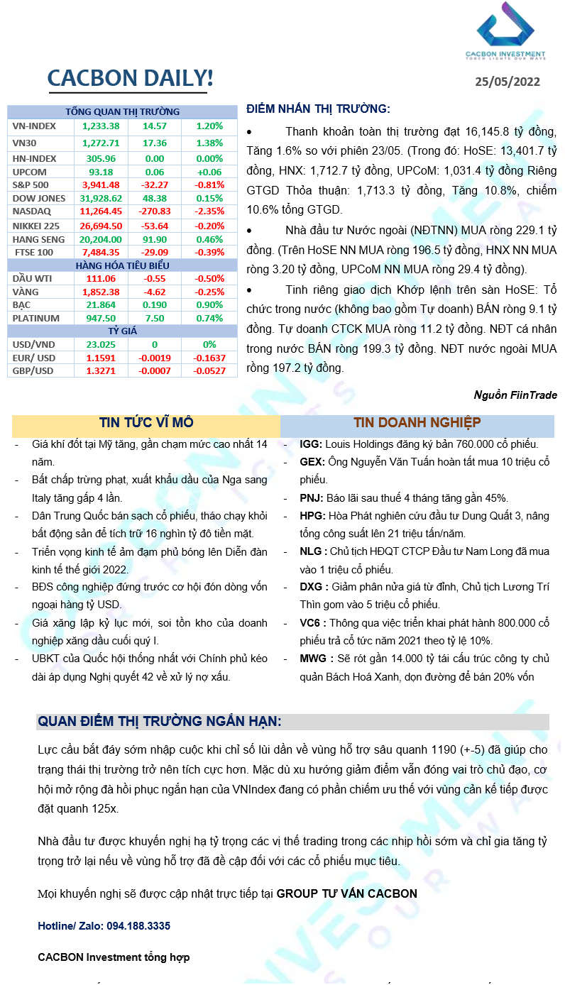 Nhật ký thị trường 25/05/2022 - Bật tăng mạnh về cuối phiên
