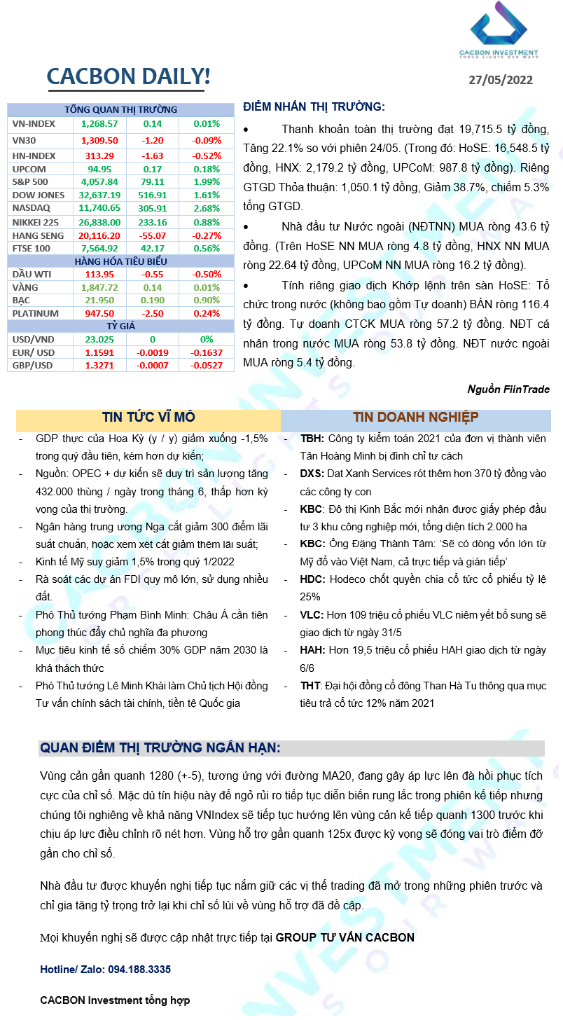 Nhật ký thị trường 27/05/2022 - Vùng cản gần quanh 1280 (+-5)