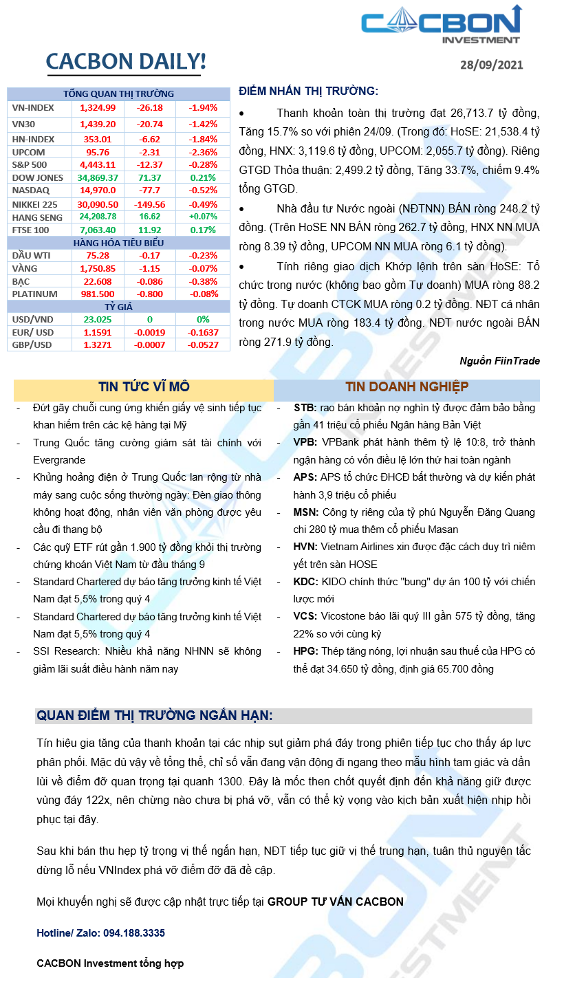 Nhật ký thị trường 28/09/2021 - Các chỉ số đóng cửa ở mức thấp nhất phiên
