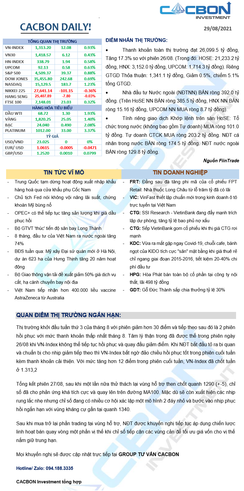 Nhật ký thị trường 29/08/2021 - VN-Index đã chạm vùng hỗ trợ 1.290 sau đó hồi phục trở lại