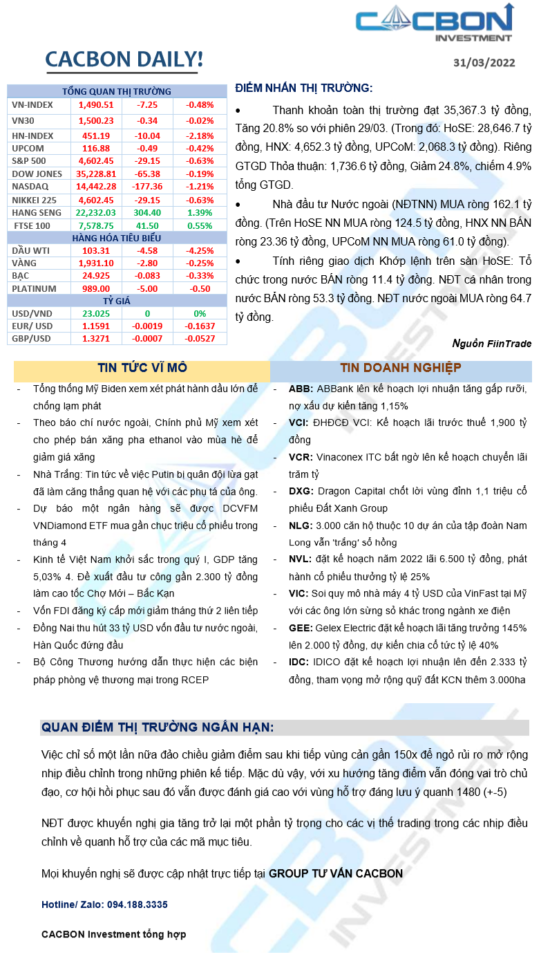 Nhật ký thị trường 31/03/2022 - Áp lực bán chiếm ưu thế